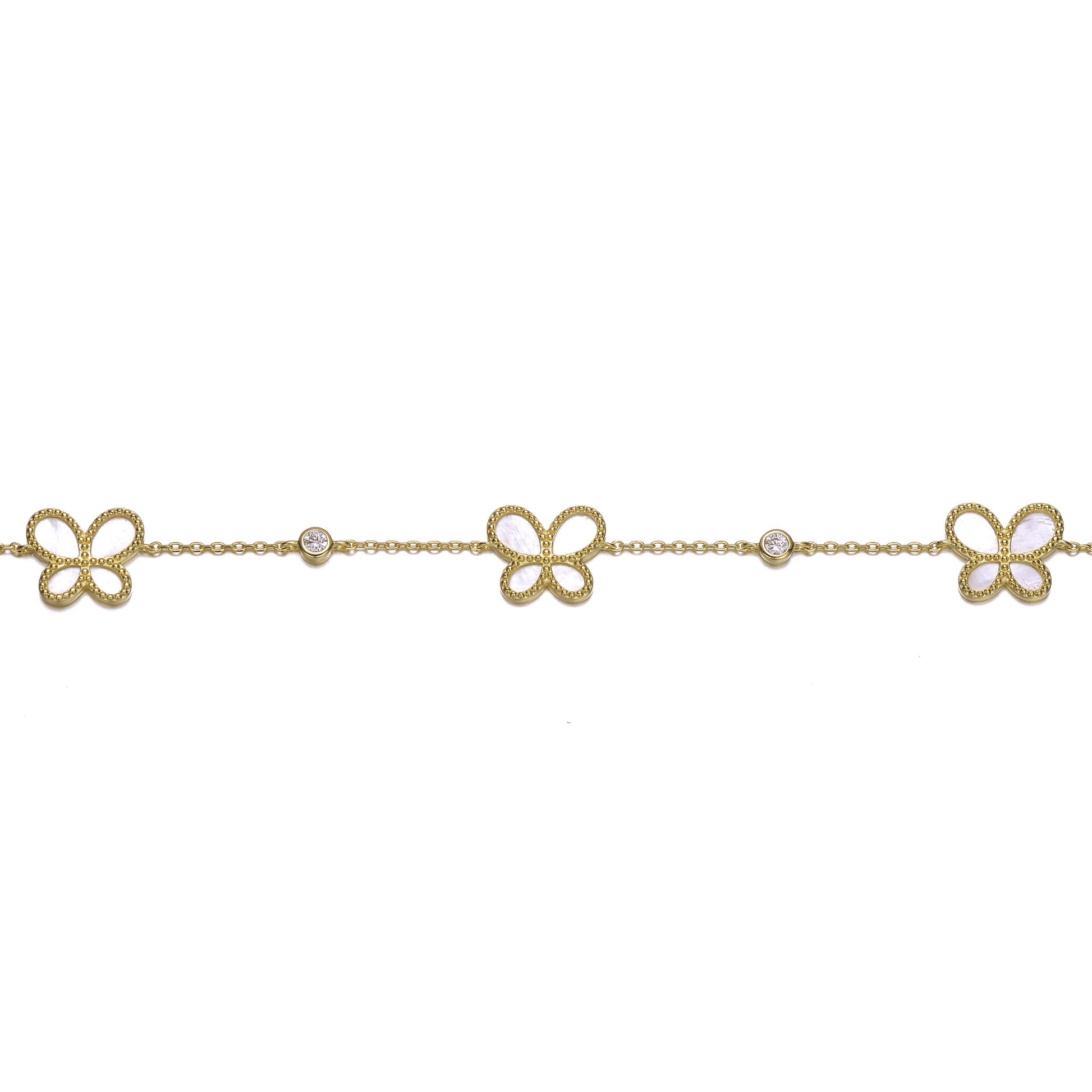 Elevate your wrist with this elegant 14k gold-plated dainty link bracelet, featuring three delicate mother of pearl butterflies spaced evenly along a 7"+1" adjustable chain. Sparkling bezel-set cubic zirconia stones between each butterfly add a touch of brilliance to this joyful, charming piece. Perfect for layering or wearing solo, it’s a versatile addition to any collection and a lovely gift for summer or year-round wear.