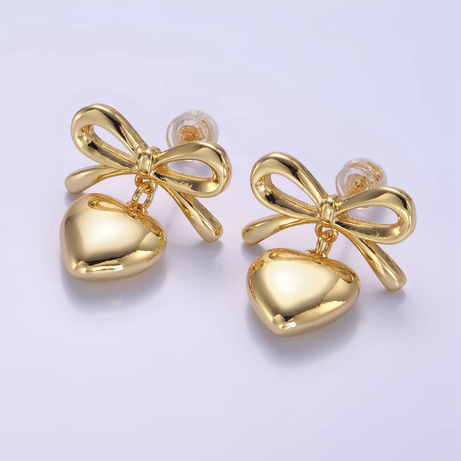 Charming and feminine, the Giselle Earrings feature a delicate heart and bow design crafted in radiant 24K gold fill. These drop stud earrings offer a perfect blend of playful elegance and timeless sophistication. With graceful curves and fine detailing, they add a romantic touch to any outfit—ideal for both everyday wear and special occasions.