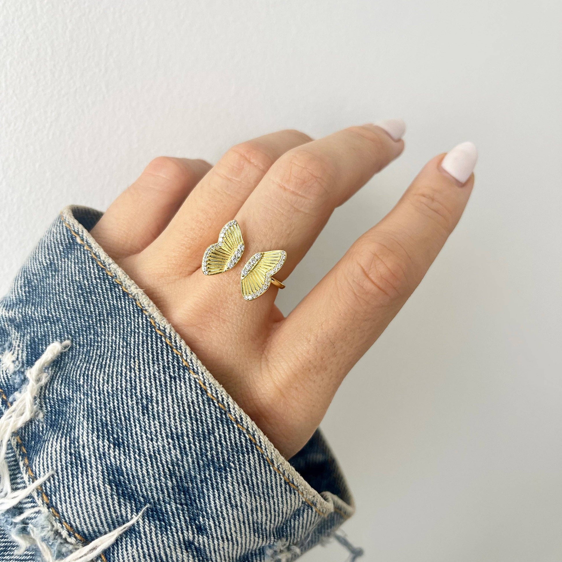 Delicate yet eye-catching, this beautifully crafted butterfly ring adds a sweet, feminine touch to any look. Made with high-quality cubic zirconia and thick 14k gold or rhodium plating over 925 sterling silver, it’s adjustable for a comfortable fit on sizes 7–9.