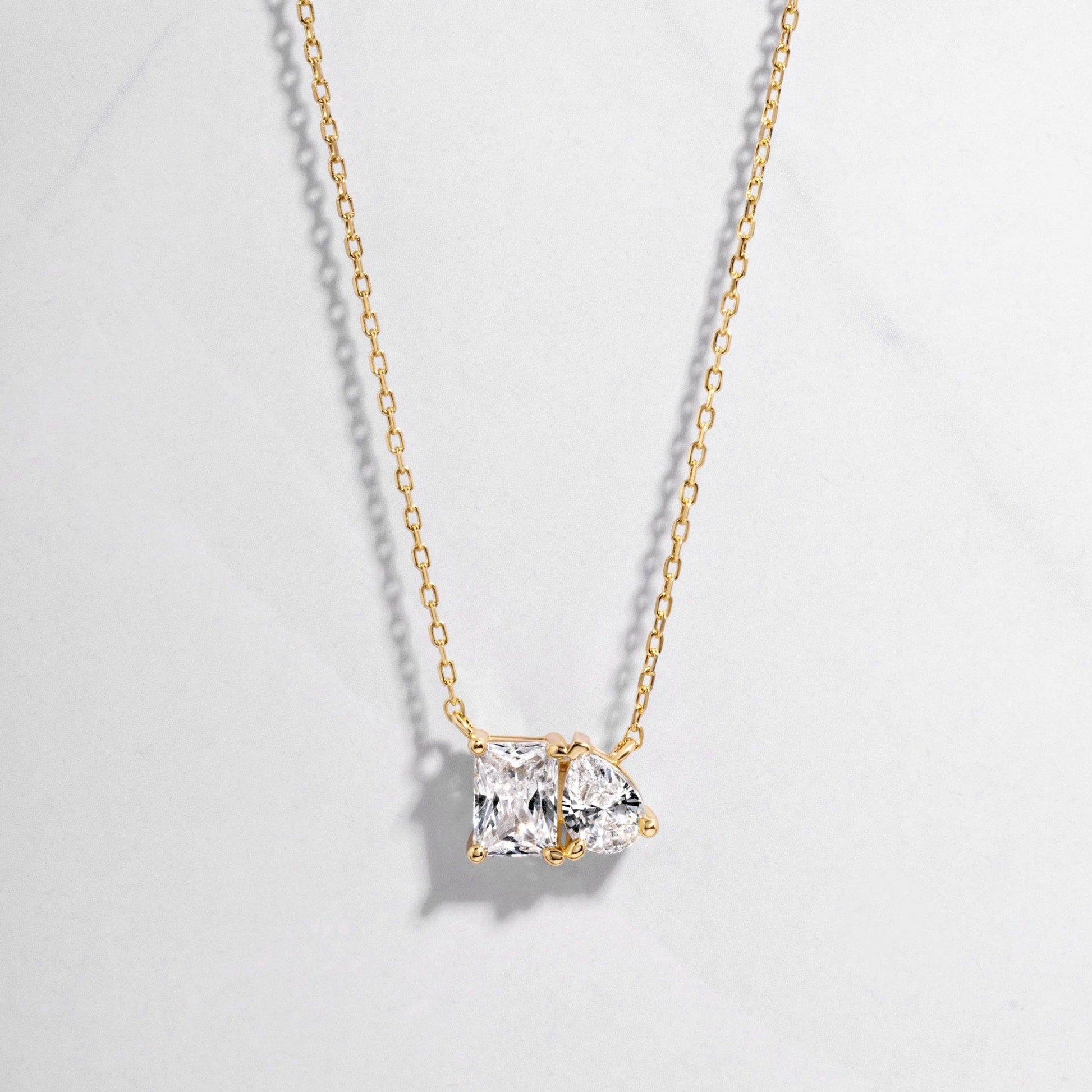 Elegant and symbolic, our Toi et Moi Necklace features two distinct yet harmonious stones: a radiant emerald-cut and a graceful pear-shaped gem, representing the union of two souls—you and me. This romantic design blends modern charm with timeless meaning, making it a perfect gift or personal statement piece.
